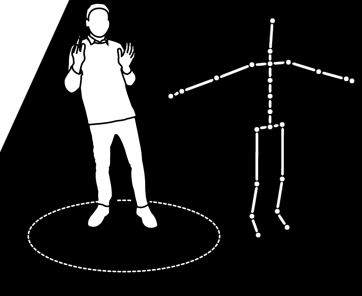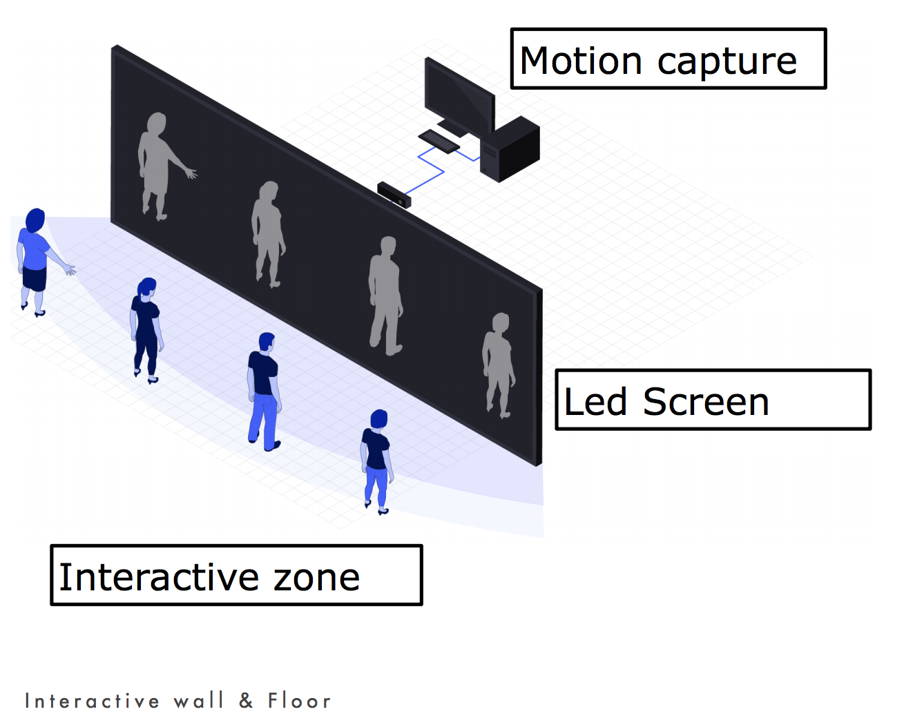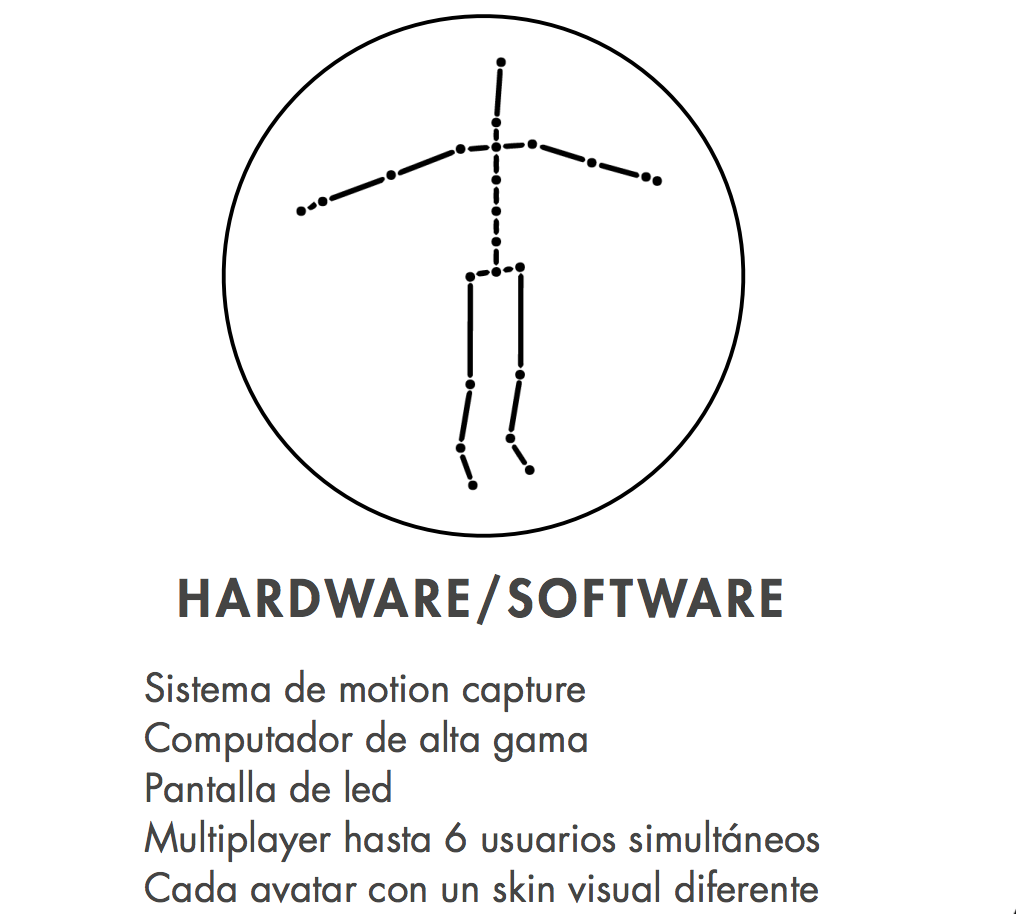 En la pantalla frontal se veia una visual, que al entrar uno a uno a la zona interactiva, activa las figuras de los avatares de los participantes, lo cuales se movián en tiempo real siguiendo los movimientos del cuerpo de los participantes con un diseño visual de partículas de colores basado en el concepto de la activación.