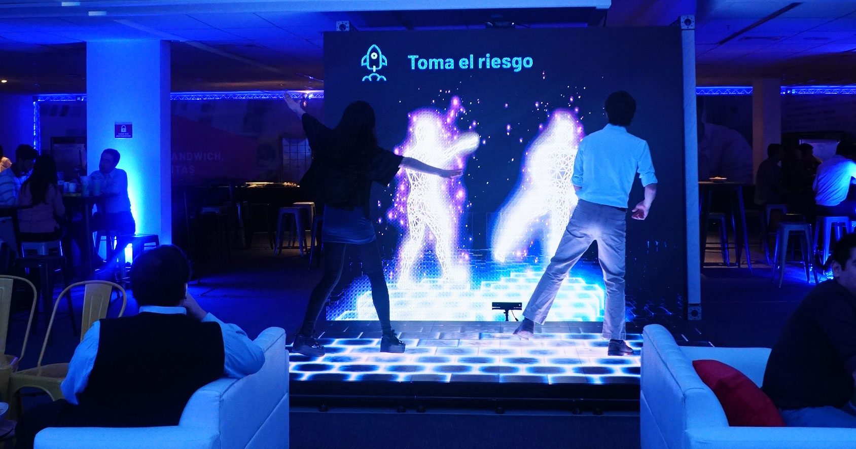 La pantalla del piso reacciona interactivamente donde pise cada participante en su zona personal y general.